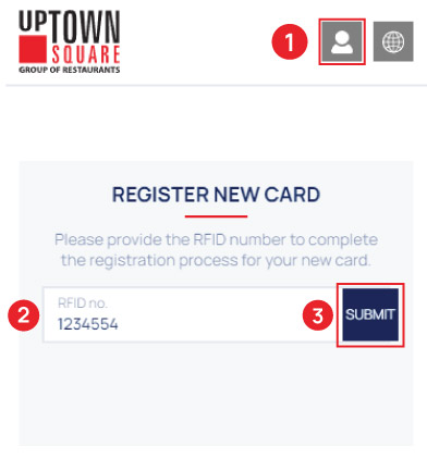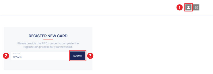 - Click the icon on the header and start typing the RFID from the card you have purchased at school, then click the "SUBMIT" button. After the first 6 digits are entered the submit button will appear.