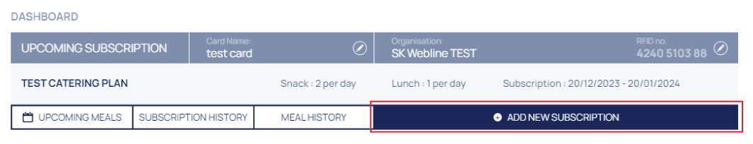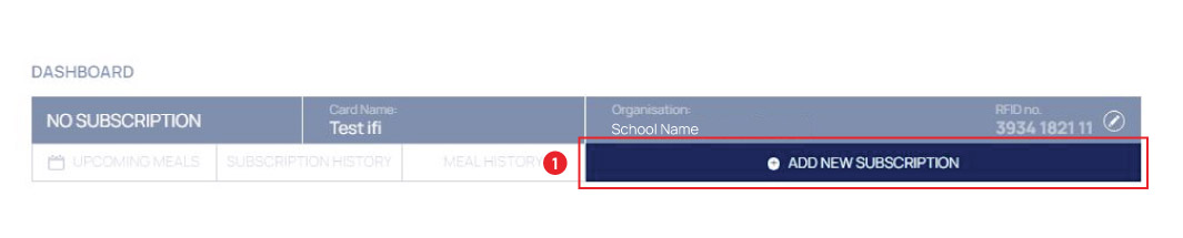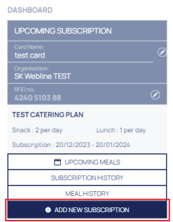 - From your dashboard at your account simply click the big blue button "ADD NEW SUBSCRIPTION". You will be directed to the meal packages page, where you can choose your plan by clicking "ADD TO CART" and then "PROCEED TO CHECKOUT"