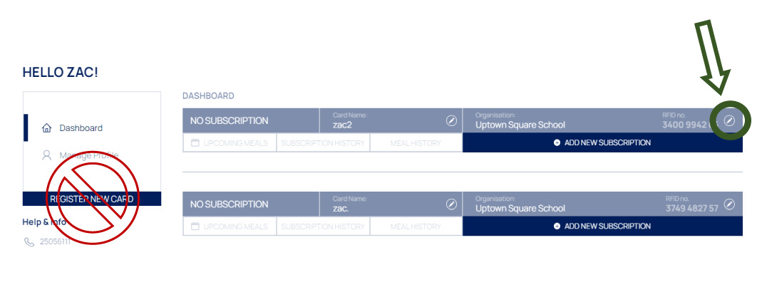 To do so, log in to your account and edit the RFID Number on the correct subscription by clicking on the PENCIL, as shown in the photo below. Delete the old number and write the new number.