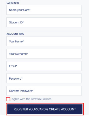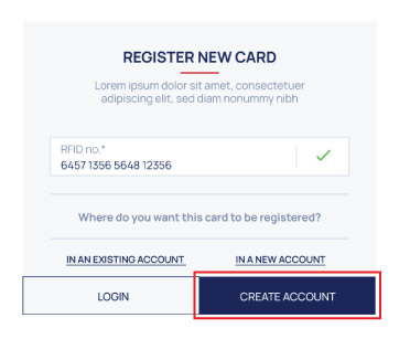- If your RFID number is correct, you can proceed to create your account by clicking “CREATE ACCOUNT”. Fill all the appearing fields, agree with the policies and complete the process by clicking “REGISTER YOUR CARD & CREATE ACCOUNT”