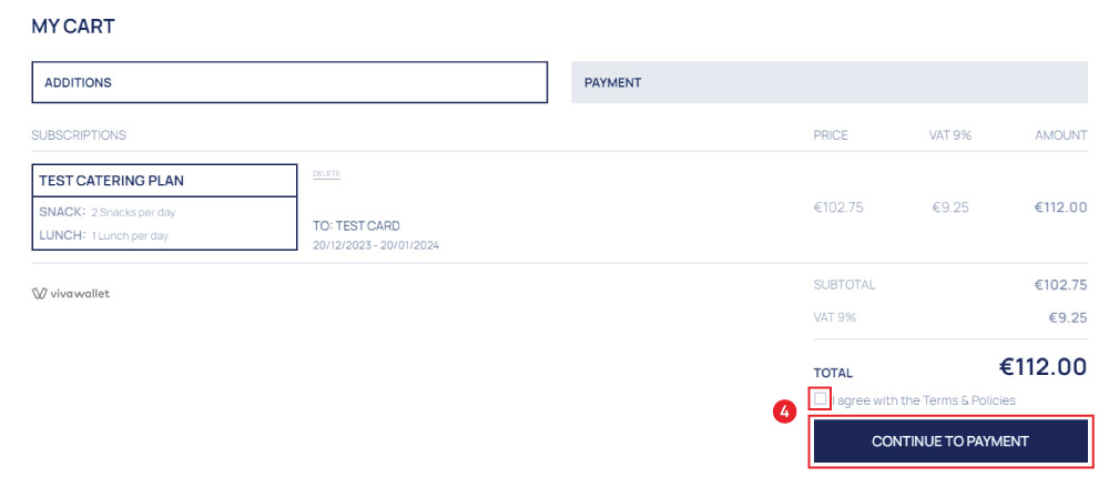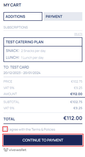 - Finally, after accepting the policies, click "CONTINUE TO PAYMENT". Complete the payment process by entering your card information, and your meal plan will be purchased and ready to use!